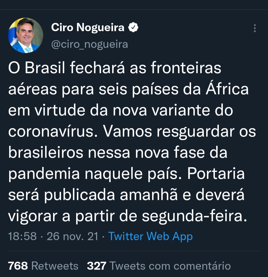 "O Brasil fechará as fronteiras aéreas para seis países da África em virtude da nova variante do coronavírus. Vamos resguardar os brasileiros nessa nova fase da pandemia naquele país. Portaria será publicada amanhã e deverá vigorar a partir de segunda-feira", disse Nogueira em rede social.
