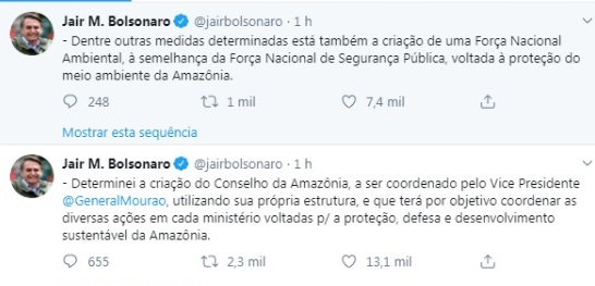 Ainda na publicação, Bolsonaro afirma que o vice-presidente Hamilton Mourão será o coordenador do conselho, que deverá organizar ações entre ministérios para "proteção, defesa e desenvolvimento sustentável da Amazônia".