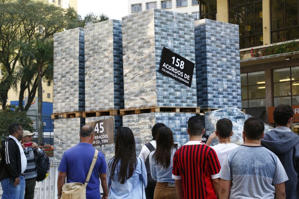 Uma exposição atraiu a atenção das pessoas que passavam pela rua XV de novembro no centro de Curitiba. A pilha de dinheiro com mais de cinco metros de altura foi exposta e seria correspondente a R$ 2 bilhões em notas de cem reais, o que é somente metade do dinheiro recuperado pela operação Lava Jato.