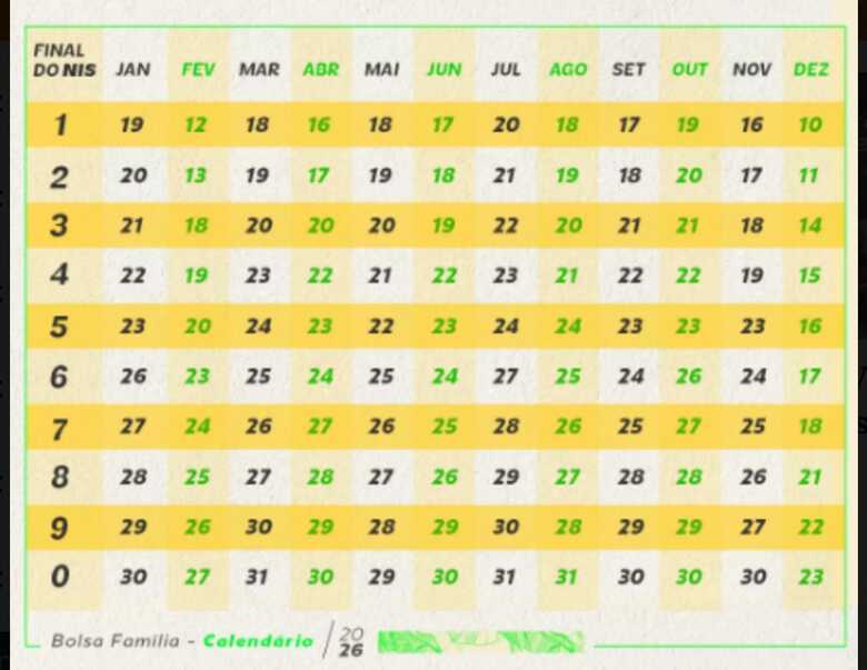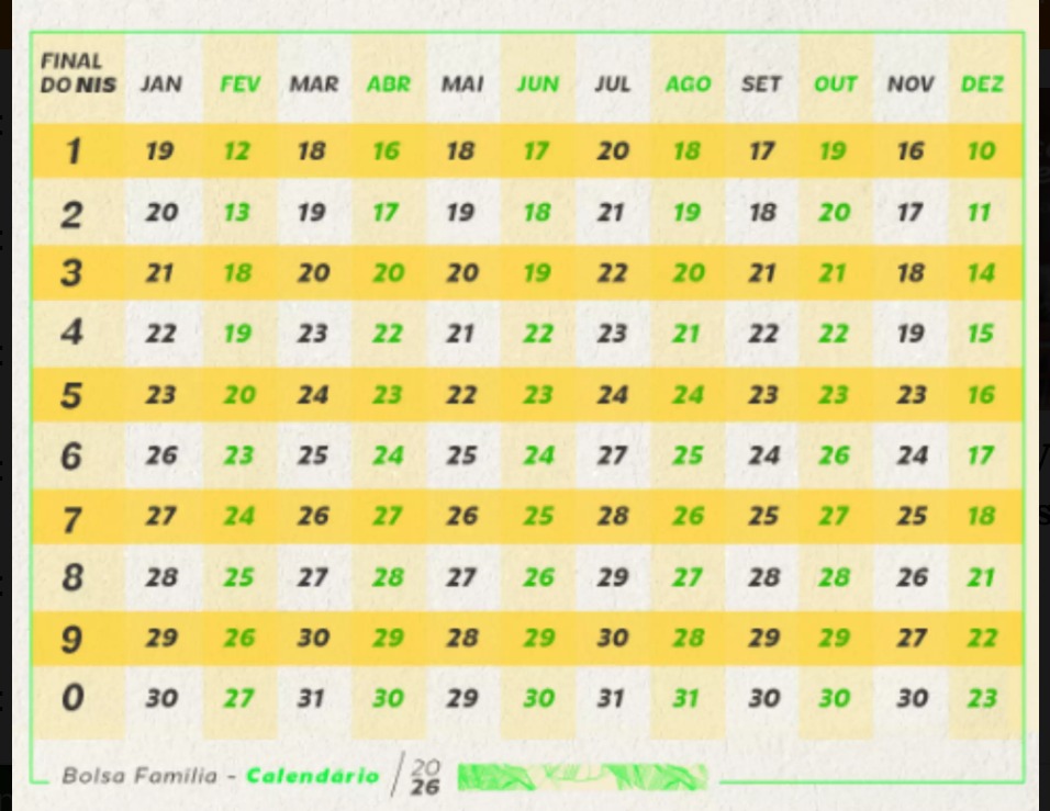 Os valores são liberados nos dez últimos dias úteis de cada mês, de forma escalonada. Beneficiários com NIS final 1 recebem no primeiro dia do calendário mensal, enquanto os de final 0 recebem no último dia previsto.