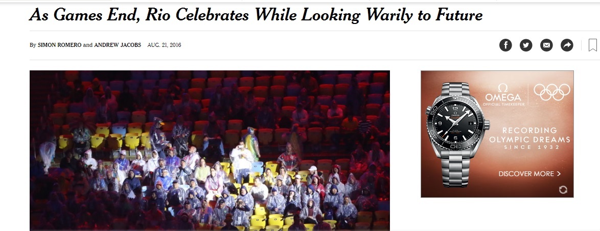 Em outra matéria, o jornal The New York Times menciona críticas aos Jogos Olímpicos Rio 2016, como os gastos excessivos para o tamanho do orçamento da cidade. No entanto, o jornal diz que os jogos alteraram profundamente a paisagem do Rio, dando oportunidade ao surgimento de um porto revitalizado, uma nova linha de metrô e de uma onda de projetos municipais que estavam há muito parados na mesa dos administradores.
