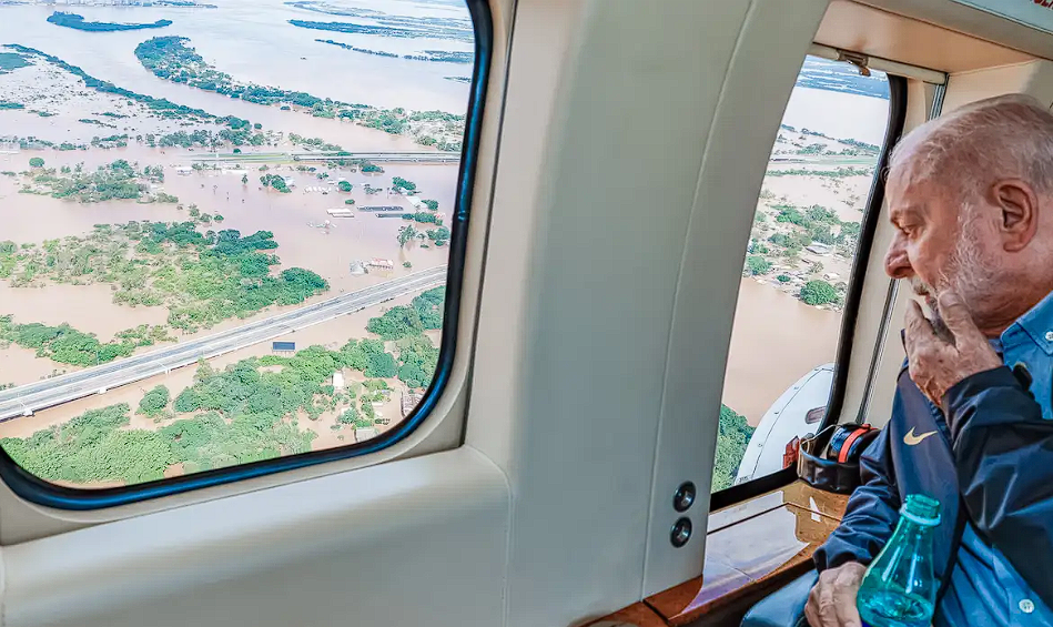 Logo após saírem da base aérea, Lula, Lira, Pacheco e Leite, sobrevoaram de helicóptero o centro de Porto Alegre. Em vídeo postado nas redes sociais de Lula, o governador Eduardo Leite mostra as redondezas do mercado municipal da capital gaúcha coberto pela água.