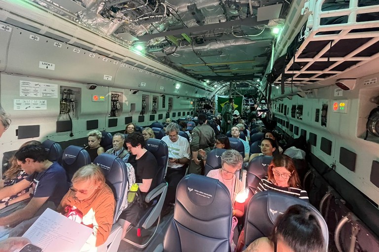 Brasileiros já embarcados no terceiro voo da operação Voltando em Paz (Foto: Gov.br / FAB)