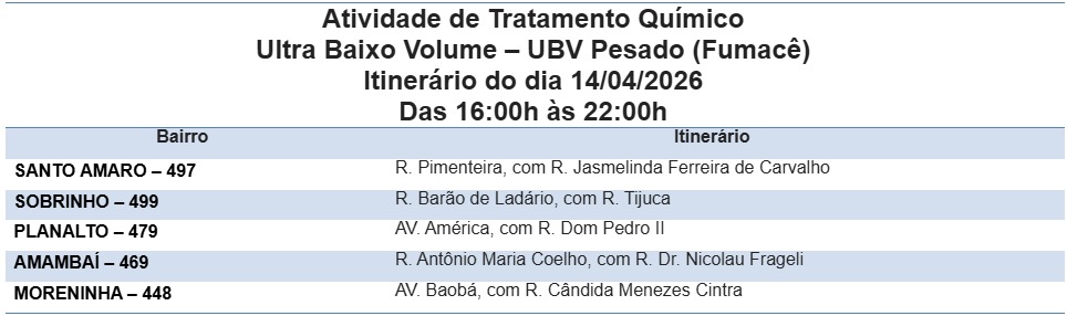A ação acontecerá nos bairros Santo Amaro, Sobrinho, Planalto, Amambaí e Moreninha, com equipes da Coordenadoria de Controle de Endemias Vetoriais (CCEV), vinculada à Secretaria Municipal de Saúde (Sesau). O serviço será realizado das 16h às 22h, por meio da borrifação ultra baixo volume (UBV), popularmente conhecida como fumacê.