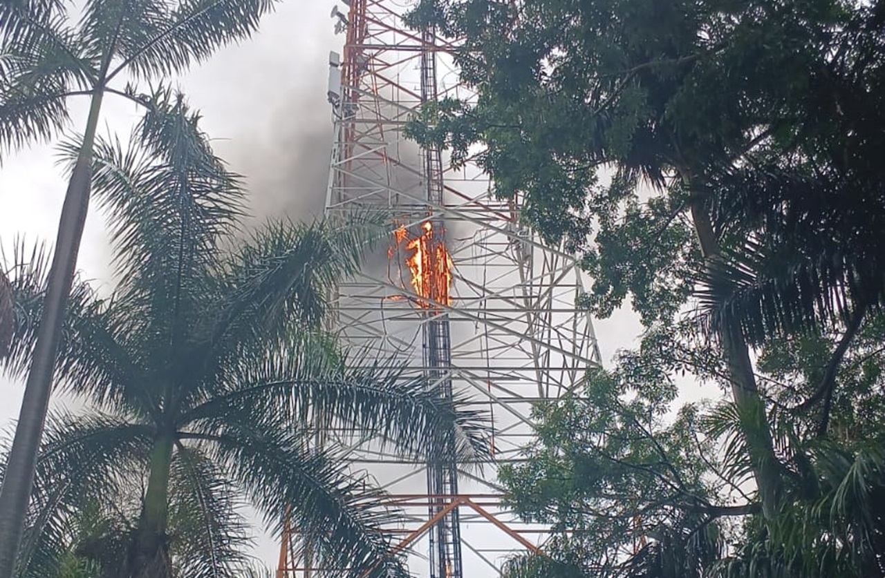 Fogo atingiu parte da antena de transmissão (WhatsApp/JD1 Notícias)