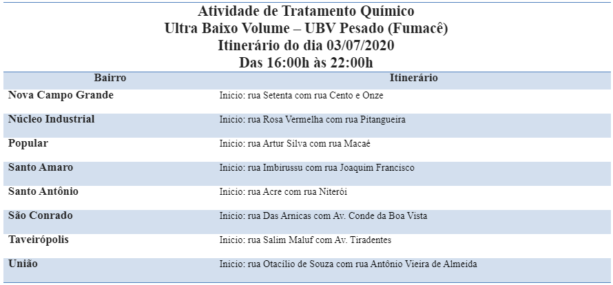 Os carros do fumacê passarão pelos bairros Nova Campo Grande, Núcleo Industrial, Vila Popular, Santo Amaro, Santo Antônio, São Conrado, Taveirópolis e União.