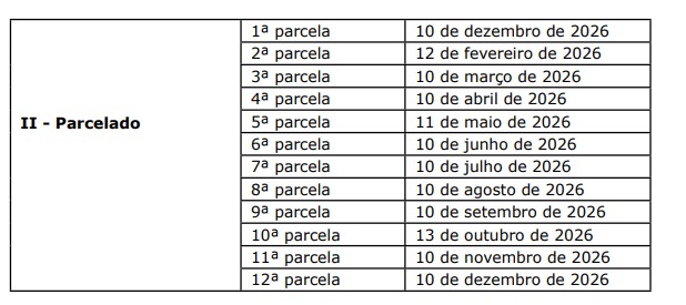 Conforme o decreto, a segunda parcela do Imposto Predial e Territorial Urbano, juntamente com a Taxa de Coleta, Remoção e Destinação de Resíduos Sólidos Domiciliares, que venceria em 10 de fevereiro, passa a ter novo vencimento em 12 de fevereiro de 2026. As demais parcelas permanecem inalteradas.