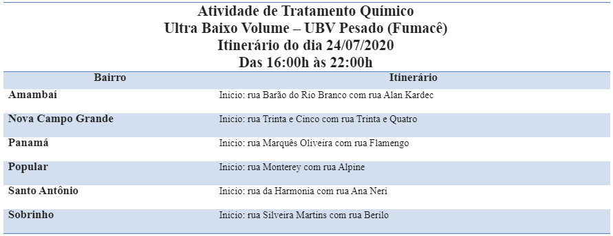 Seis bairros da cidade irão receber o serviço de borrifação Ultra Baixo Volume (UBV), o Fumacê, nesta sexta-feira (22). As equipes passarão pelos bairros: Amambaí, Nova Campo Grande, Jardim Panamá, Vila Popular, Santo Antônio e Vila Sobrinho.