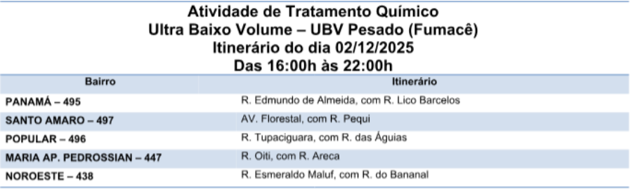 O combate ao Aedes aegypti será intensificado nesta terça-feira (02) em Campo Grande, com a aplicação do serviço de UBV (Fumacê) em cinco bairros da Capital. As equipes da Gerência de Controle de Endemias Vetoriais circulam das 16h às 22h pelos seguintes locais: Jardim Panamá, Santo Amaro, Vila Popular, Maria Aparecida Pedrossian e Jardim Noroeste.