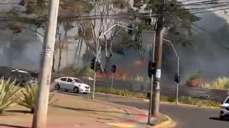 Um terreno baldio, localizado no cruzamento da Avenida Rachid Neder com a Rua Rui Barbosa pegou fogo durante a tarde desta quarta-feira (10), em Campo Grande.