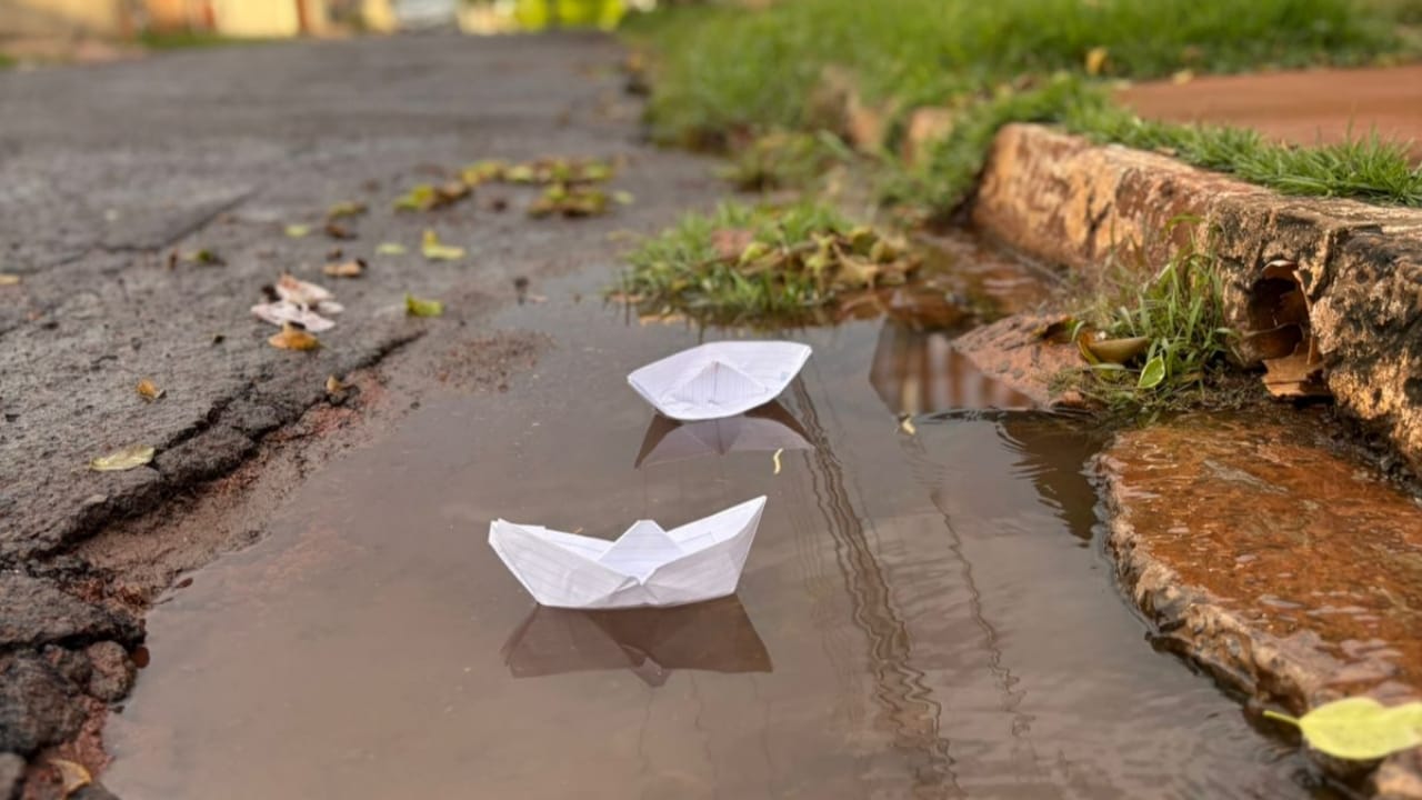 Moradores da Vila Planalto, em Campo Grande, inovaram no protesto contra o IPTU e colocaram barquinhos de papel em buracos, criando uma imagem bastante conceitual.