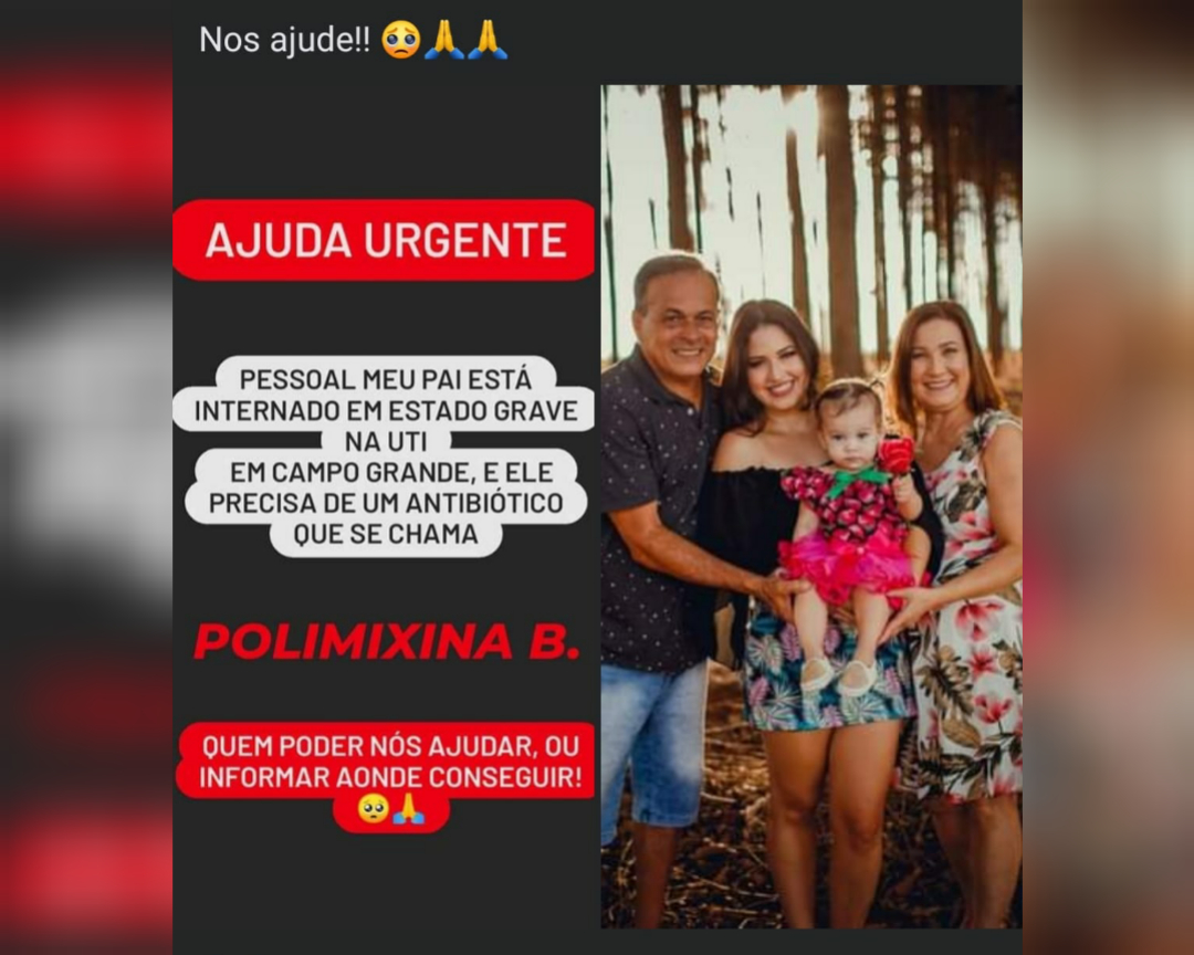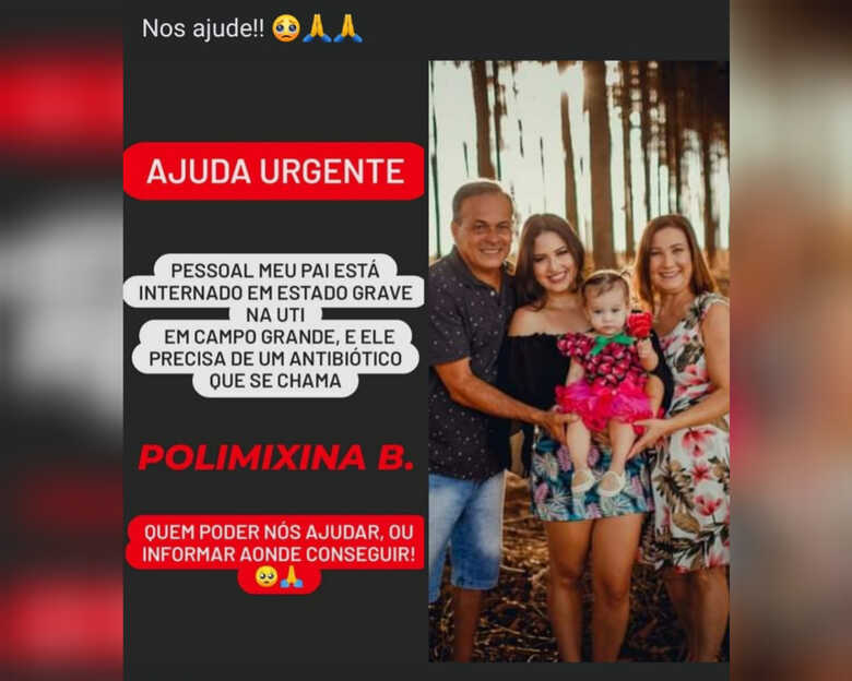 A família de Degalma Aguirre, de 56 anos, faz um pedido urgente de ajuda por um medicamento que está em falta no País, o Polimixina B, remédio usado para tratamento de infecção aguda. Aguirre está internado na Unidade de Terapia Intensiva do Hospital Regional de Campo Grande desde o dia 20 de março, para tratar a Covid-19, segundo a esposa, lá dentro ele contraiu uma bactéria.