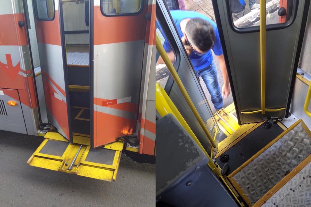 Minutos depois, o condutor do transporte conseguiu ajustar e seguiu caminho. Alguns pontos depois, o motorista foi abrir a porta do coletivo e a mesma plataforma que tinha dado defeito, começou a apitar, sem ter acionada e foi descendo, travando ao meio a porta.