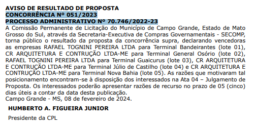 Na última sexta-feira (9), a Prefeitura de Campo Grande, sob a gestão da prefeita Adriane Lopes, tornou público o andamento da licitação destinada à reforma dos terminais de ônibus na capital. A divulgação ocorreu por meio do Diogrande.