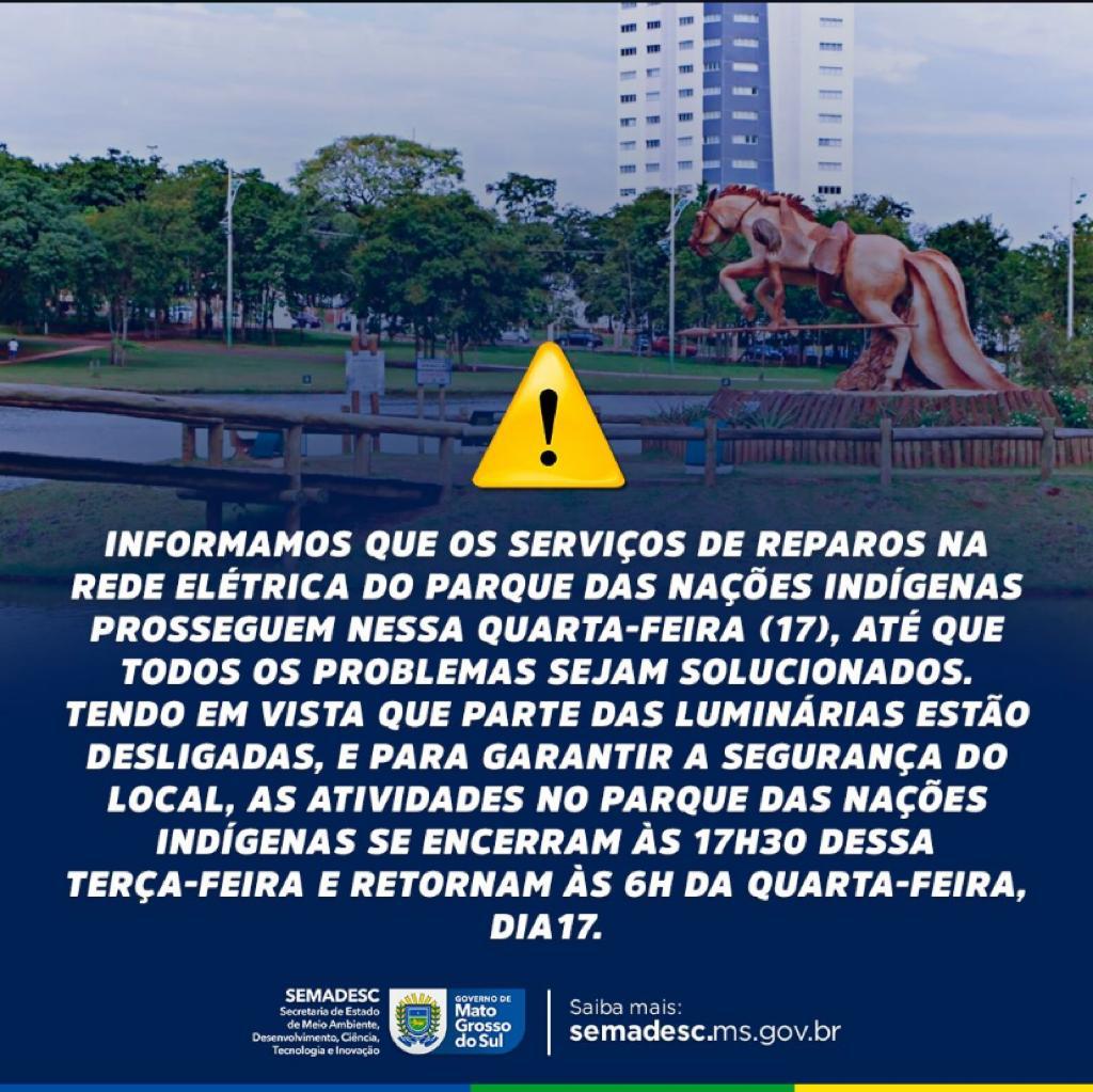 Ainda com o problema de iluminação sem solução, o Parque das Nações Indígenas fechará mais cedo nesta terça-feira (16). O funcionamento do parque será encerrado às 17h30, sendo reaberto amanhã (17) às 6h.