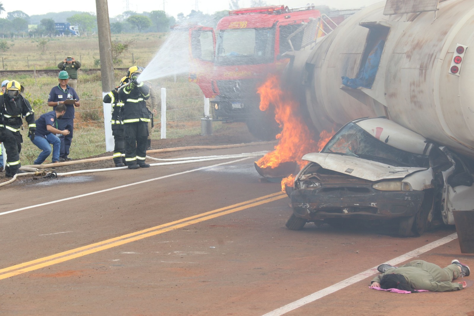 Entre as situações previstas estão vítimas arremessadas dentro do veículo por falta do cinto de segurança, além de múltiplos feridos após o tombamento do ônibus. O exercício também inclui procedimentos de contenção de produto perigoso, resgate, controle do tráfego e atendimento pré-hospitalar.