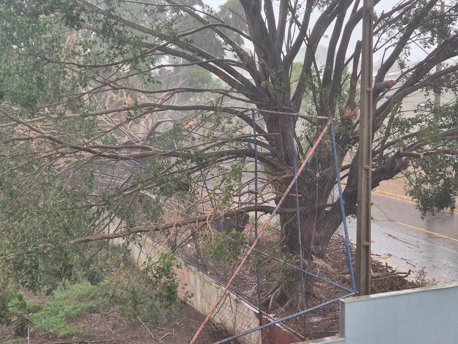 A situação envolve queda de árvores, galhos, placas e telhas que foram lançadas sobre a fiação, causando queda de postes e rompimento de cabos, provocando assim, a interrupção no fornecimento de energia elétrica.