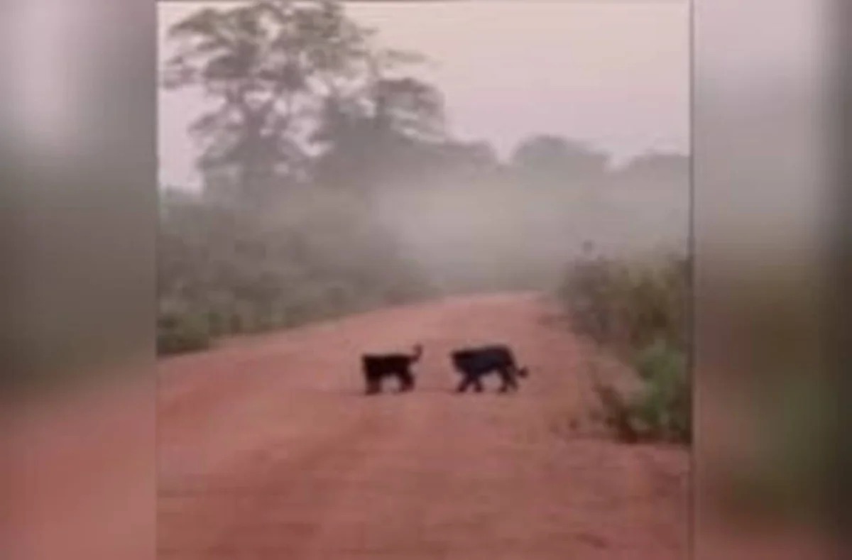 A aparição de uma onça-preta com o filhote, que esturrava pela mãe, foi flagrada por um agrônomo. Paulo Aldair Dias Borges foi quem registrou o momento raro em uma estrada no Mato Grosso.