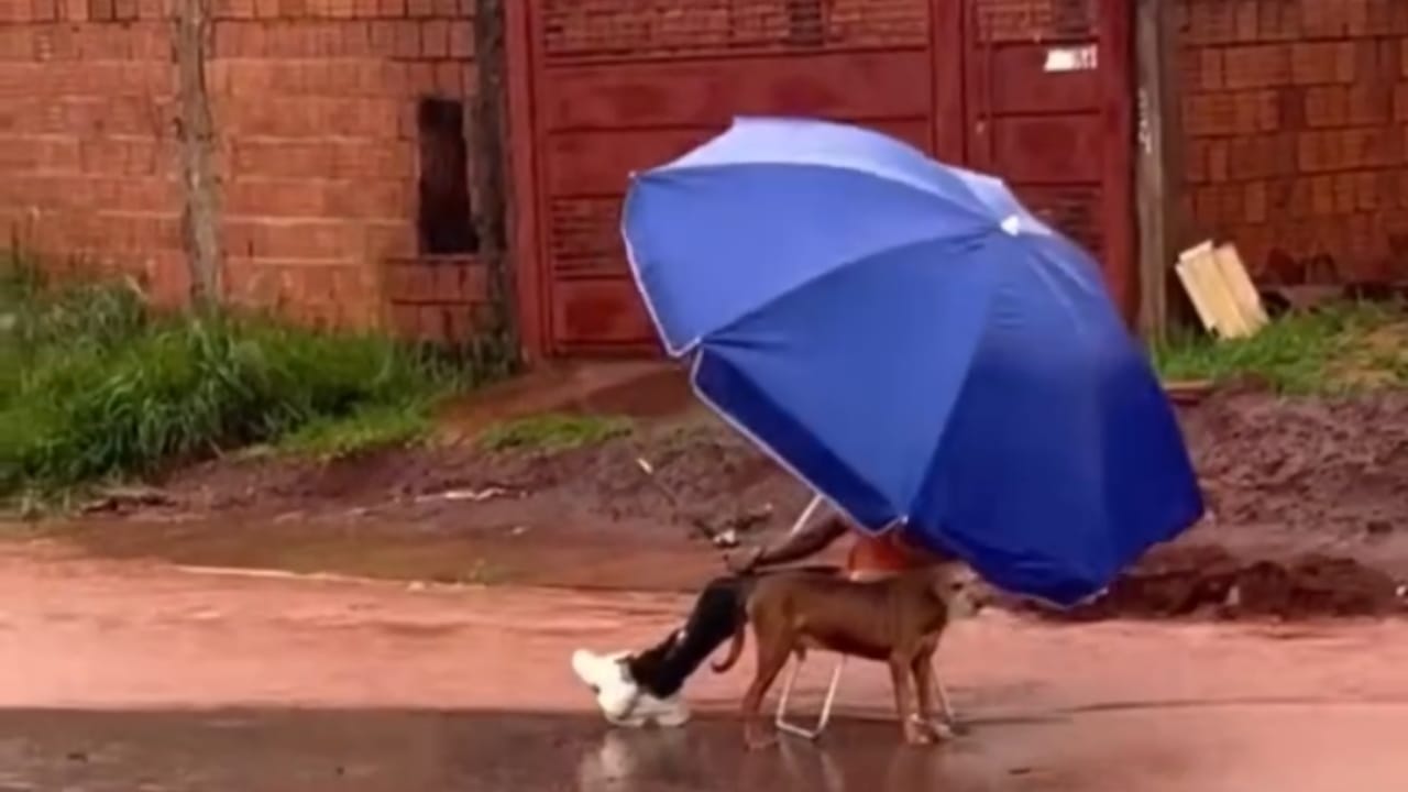 No vídeo, divulgado pela página do Instagram Campo Grande Mil Fita, o homem apareceu sentado em uma cadeira, segurando um guarda-sol e ‘pescando’, enquanto está acompanhado de um cachorro.