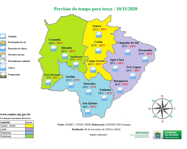A umidade relativa do ar com variação estimada entre 50% a 100% no MS ao longo do dia. Temperaturas no Estado poderão variar entre de 18 °C a 39 °C e na capital variação está estimada em 20 °C a 33 °C.