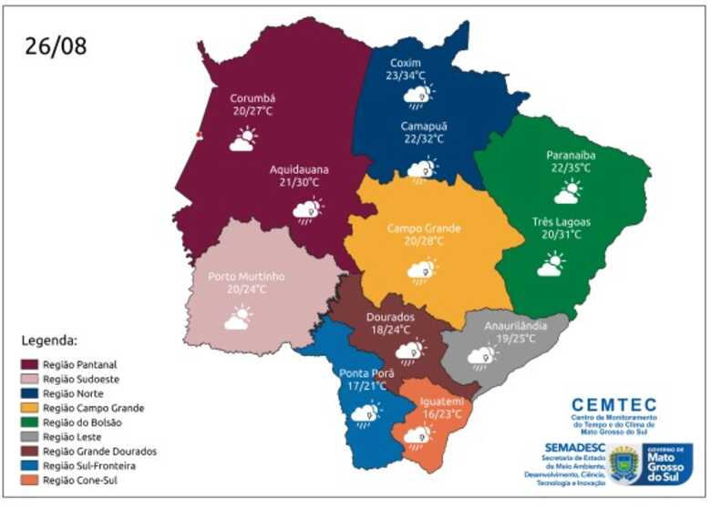 Em Corumbá, na região pantaneira, a mínima será de 20°C e máxima de 27°C; Aquidauana terá variação entre 21°C e 30°C. No sudoeste, Porto Murtinho amanhece com 20°C e atinge os 24°C. No norte, Coxim terá 23°C cedo e alcançará os 34°C ao longo do dia. No Bolsão, Três Lagoas registra 20°C pela manhã e 31°C de tarde.