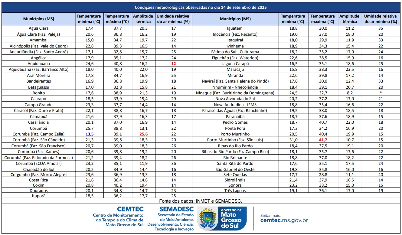 O domingo (14) foi marcado por altas temperaturas e baixa umidade do ar em diversas cidades de Mato Grosso do Sul, segundo dados do Centro de Monitoramento do Tempo e do Clima de MS (Cemtec). O município de Porto Murtinho (Fazenda São Luís) registrou a temperatura mais alta do estado, com os termômetros chegando a 41,7°C.