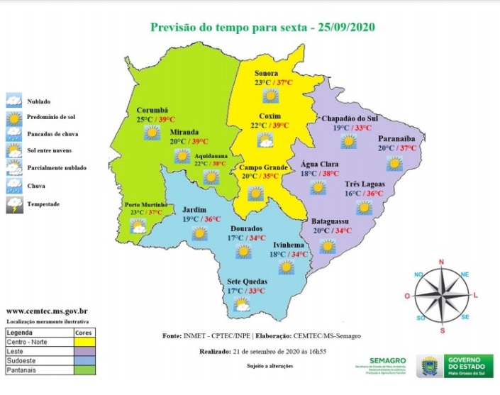 As temperaturas em Mato Grosso do Sul poderão variar entre de 16 °C a 39 °C.