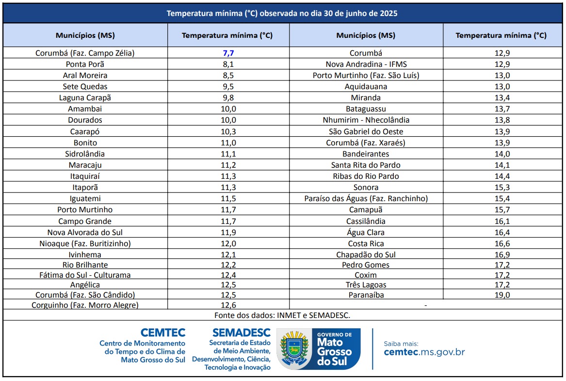 Em Corumbá, cidade conhecida por suas altas temperaturas, a mínima marcou 7,7°C, conforme o Centro de Monitoramento do Tempo e do Clima (Cemtec). Outras cidades que fiaram entre 8°C e 10°C foram Ponta Porã, Aral Moreira, Sete Quedas, Laguna Carapã, Amambai e Dourados.