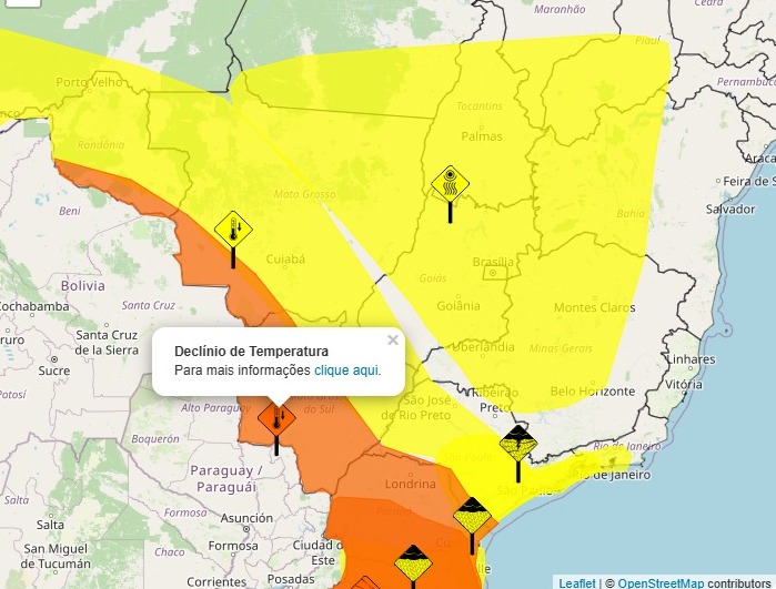 Além das temperaturas mais baixas, agora, devido também ao deslocamento de cavados que favorecem a instabilidade, a chance de chuva aumenta. Além disso, todo o estado está sob alerta de declínio de temperatura até a noite de hoje, divulgado pelo Instituto Nacional de Meteorologia (Inmet).