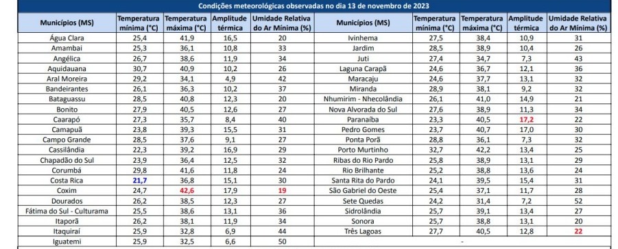 O Centro de Monitoramento do Tempo e do Clima (Cemtec) divulgou as temperaturas atingidas por cidades sul-mato-grossense na segunda-feira (13), sendo que a maior delas foi registrada em Coxim com 42,6C°.