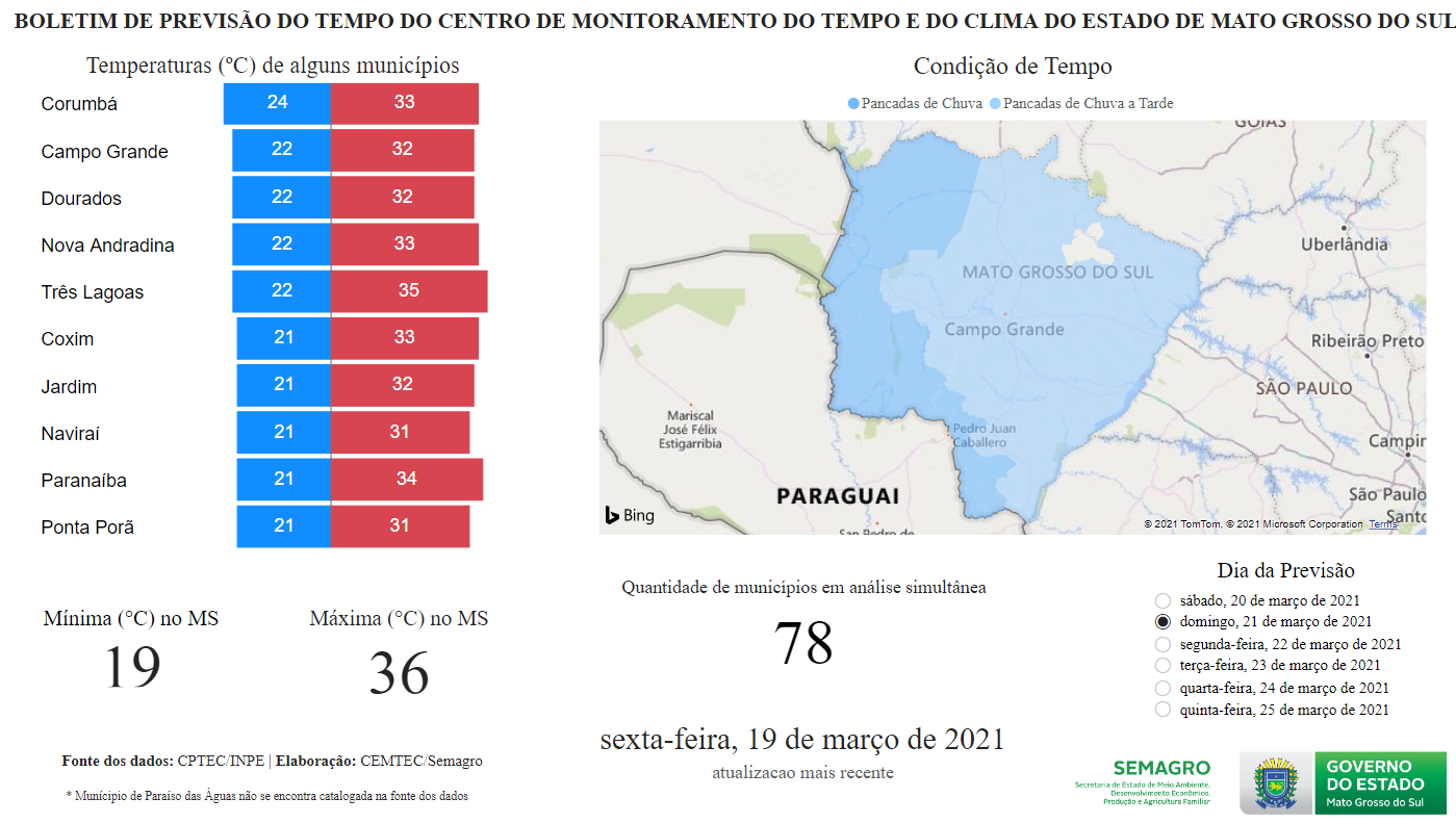 A previsão é de céu parcialmente nublado com possibilidade para pancadas de chuvas em todo o Estado. Temperaturas em Mato Grosso do Sul poderão variar entre de 19°C a 36°C e na capital a variação está estimada em 22°C a 32°C.