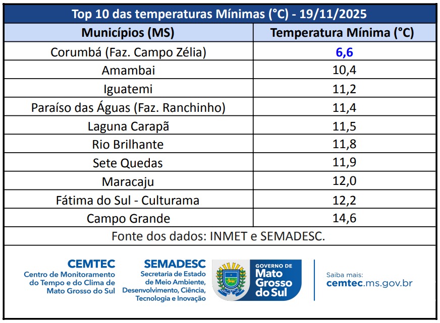 Outros municípios também tiveram amanhecer frio. Amambai registrou 10,4°C, enquanto Iguatemi chegou a 11,2°C. Na região de Paraíso das Águas (Fazenda Ranchinho), a mínima chegou a 11,4°C, seguida por Laguna Carapã, com 11,5°C, e Rio Brilhante, que marcou 11,8°C.