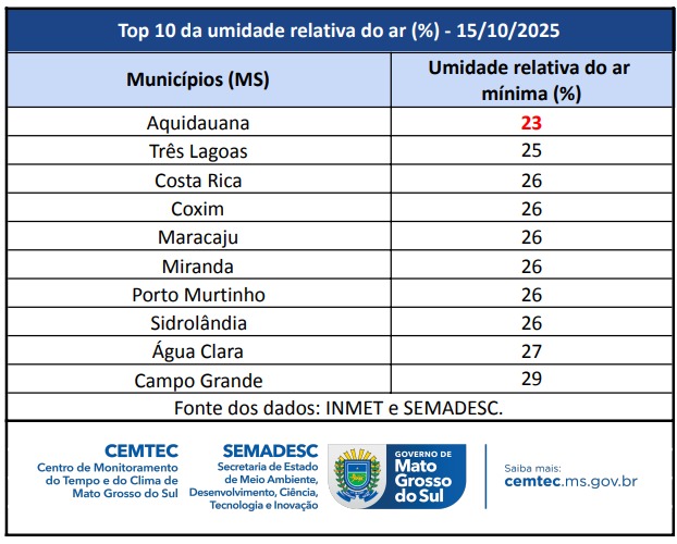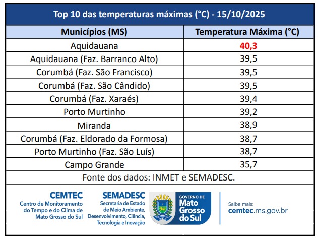 O Centro de Monitoramento do Tempo e do Clima (Cemtec) divulgou as temperaturas das últimas 24h, registradas na quarta-feira (15), em Mato Grosso do Sul com máximas extremamente altas e baixos índices de umidade relativa do ar.