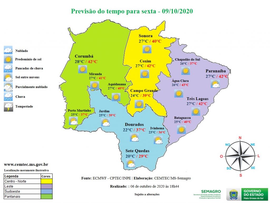 As temperaturas em Mato Grosso do Sul poderão variar entre de 20°C a 43°C.O Inmet ainda alerta para probabilidade de chuvas intensas em algumas áreas do leste do Estado. Veja o mapa de temperatura.