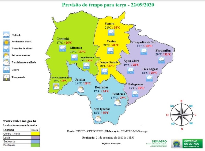 Em Campo Grande, a previsão do Cemtec é de que a temperatura máxima não passe dos 27°C ao longo do dia, e a mínima pode chegar a 18°C principalmente a noite. A capital terá pancadas de chuva isolada e trovoadas.