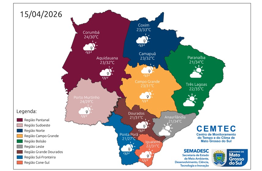 Mato Grosso do Sul terá quarta-feira (15) instável, conforme o Cemtec (Centro de Monitoramento do Tempo e do Clima). Em Campo Grande, o dia começa com sol entre nuvens, mas a previsão indica aumento de nebulosidade ao longo das horas, com chance de chuva e tempestades acompanhadas de raios e rajadas de vento. As temperaturas na Capital variam entre 20°C e 30°C.