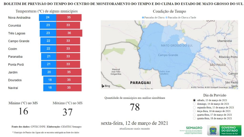 Segundo Cemtec, temperaturas em Mato Grosso do Sul devem variar entre 16°C a 37°C. Na capital, termômetros marcam entre 22°C a 33°C.
