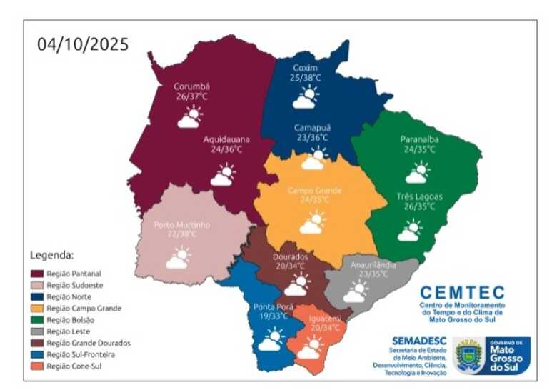 Mato Grosso do Sul terá um sábado (4) de tempo firme, com predomínio de sol e poucas nuvens ao longo do dia, devido à atuação de um sistema de alta pressão atmosférica. As temperaturas devem atingir valores extremos, com máximas entre 38°C e 41°C em regiões como norte, sudoeste, pantaneira e bolsão.