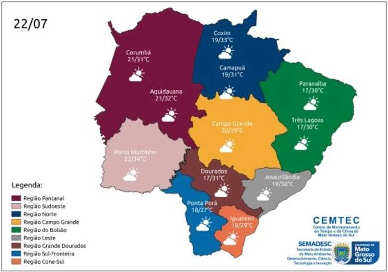 No Estado a temperatura máxima pode chegar até 34°C em Porto Murtinho, na região de fronteira com o Paraguai. Já a mínima fica em 17°C nas regiões Sul e Sudeste. Não tem expectativa de chuva.