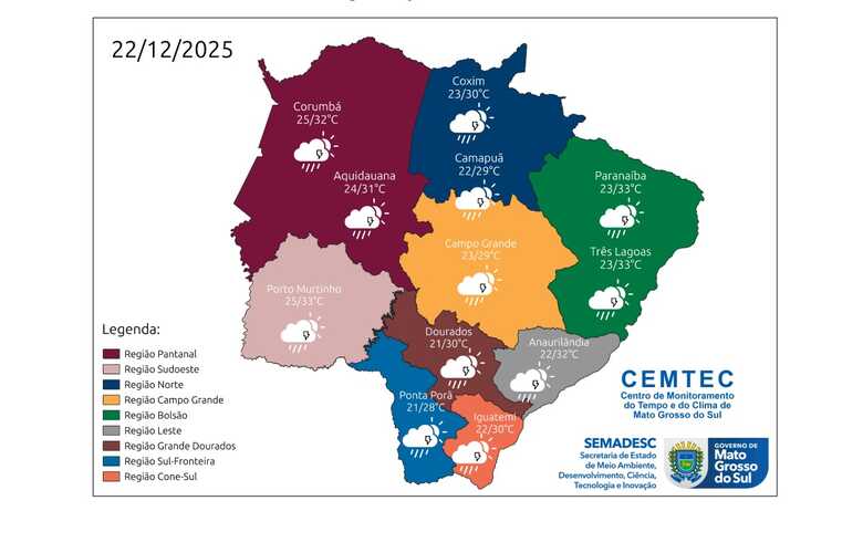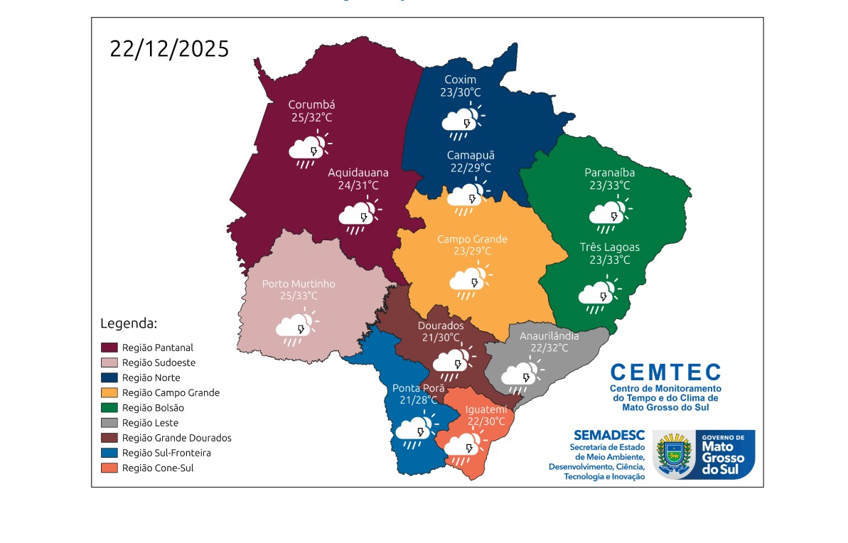 De acordo com o Cemtec, as temperaturas permanecem elevadas. Nas regiões Sul, Cone-Sul e Grande Dourados, as mínimas variam entre 20 °C e 22 °C, enquanto as máximas ficam entre 28 °C e 31 °C. Já nas regiões Pantaneira e Sudoeste, os termômetros devem marcar mínimas entre 24 °C e 26 °C, com máximas que podem alcançar de 31 °C a 35 °C.