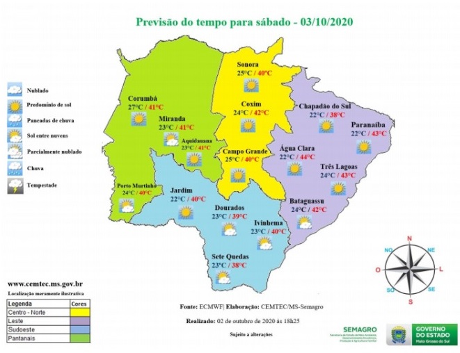 Com vento fraco a moderado em todas as regiões, as temperaturas em Mato Grosso do Sul poderão variar entre de 25 °C a 40 °C, sendo as cidades da região leste como Água Clara e Paranaíba as que sofreram com o maior calor registrando até 44°C.