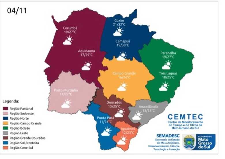 De acordo com o Cemtec, Campo Grande tem mínima de 16°C e máxima de 26°C. As temperaturas mais baixas devem ser registradas nas regiões Sul e Leste de Mato Grosso do Sul, com mínimas previstas entre 9°C e 14°C e máximas que podem atingir 24°C.
