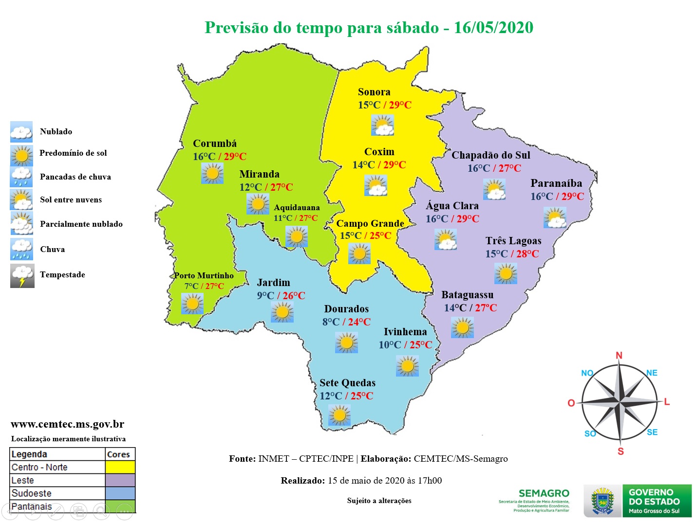 De acordo com o Instituto Nacional de Meteorologia (Inmet), em Campo Grande clima pode ficar um pouco mais frio, com máxima de 24°C e mínima de 12°C, com queda de temperatura principalmente na madrugada.
