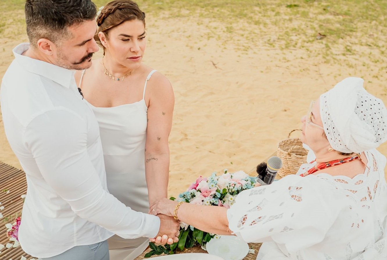 Juntos desde 2018, o casal optou por um elopement wedding, estilo de celebração que inclui apenas os noivos. A modalidade está em alta no Brasil e é bastante procurada não apenas por quem quer renovar votos como também por quem deseja casar sem reunir convidados, ou gastando menos do que numa cerimônia tradicional.