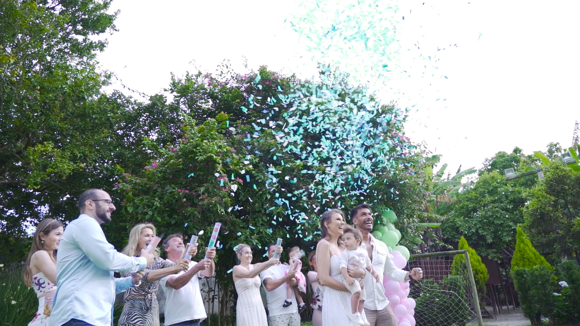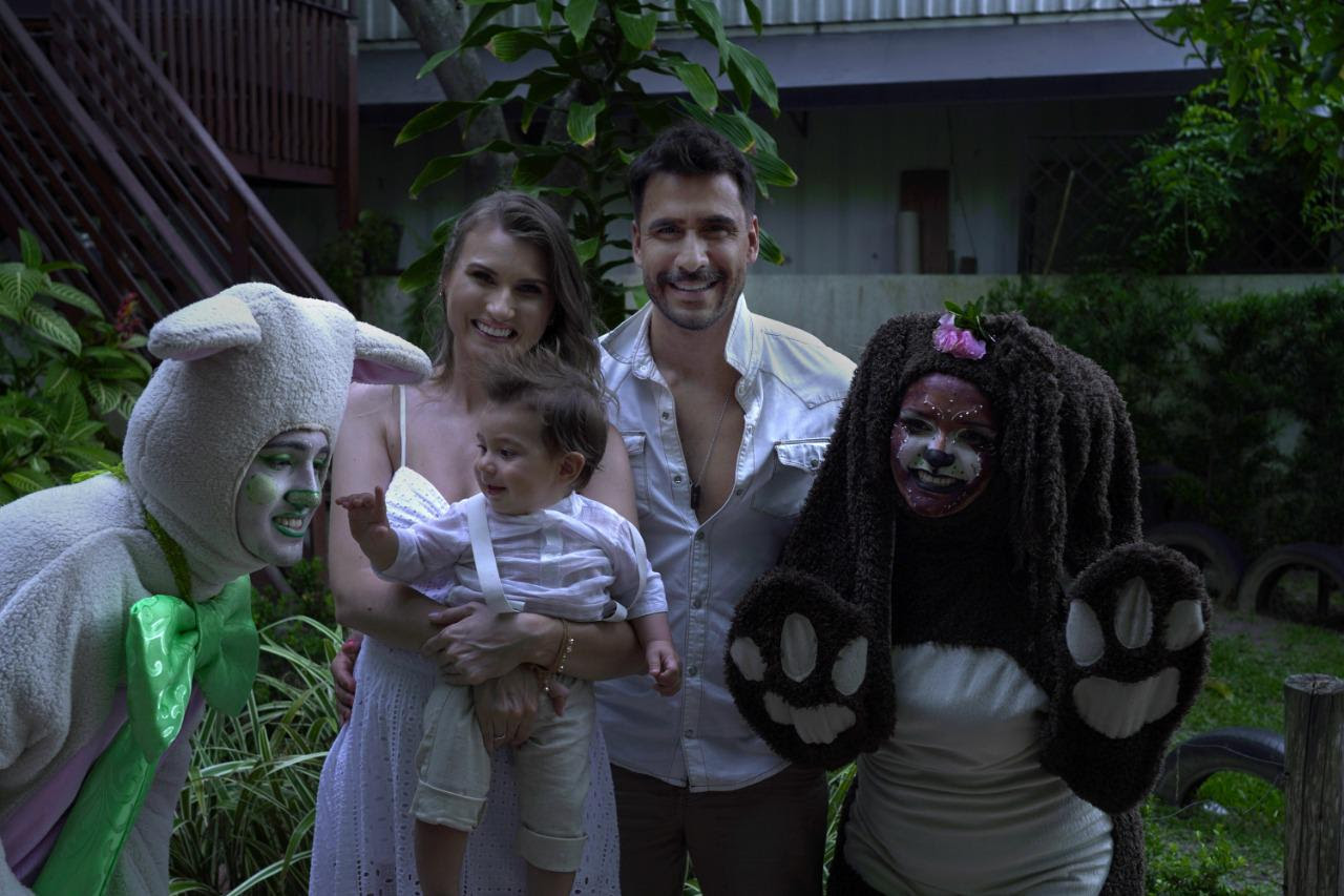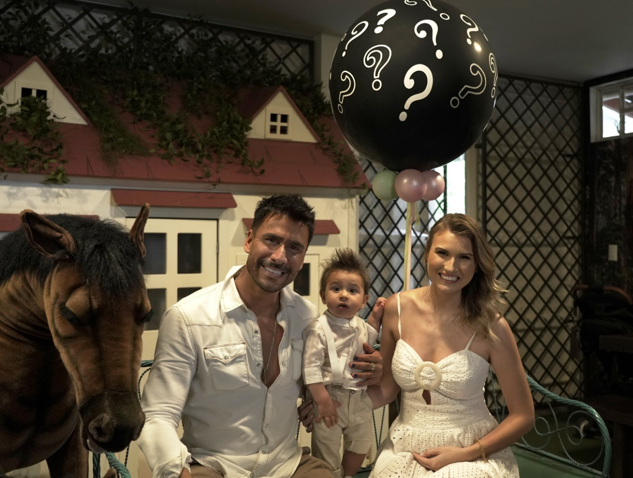 A decoração do evento era em clima campestre, com direito a cavalos de pelúcia e pessoas fantasiadas de animais, que animaram ainda mais o chá revelação. Durante a comemoração, o ator, que está no ar na segunda temporada de Ilha de Ferro, no Globoplay, entrou no clima e pintou as unhas de rosa e azul, uma brincadeira antes do anúncio mais esperado do dia.