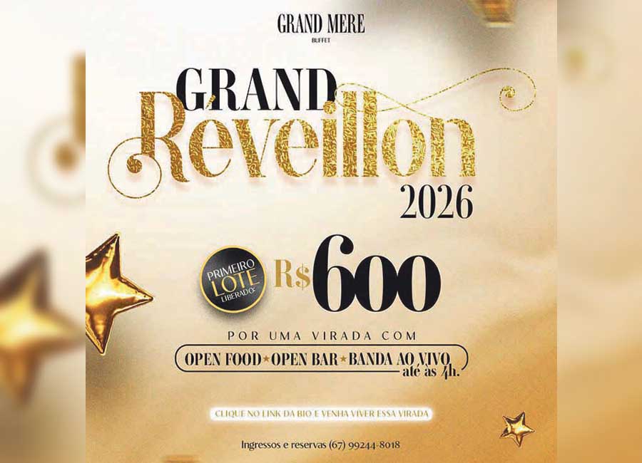 REVEILLON NO GRAND MERE BUFFET- Viva a alegria do ano novo com a sofisticação que você merece no Grand Mere Buffet que oferecerá: open bar (Heineken; whisky 12 anos; espumante importado e drinks by Show Bar Experience ) ; open food (Buffet luxuoso); atrações musicais (banda de abertura, banda de virada ; Érica Espíndola e Dj); espaço kids! Investimento :convite individual 1o lote r$ 600 reais ; mesa com 8 lugares r$ 4,800 ( com desconto de 10% a vista via pix ou em dinheiro ou cartão de crédito em 6 vezes sem juros)! A festança irá das 21h até as 4horas! Imperdível! Mais informações pelo telefone 99640-9092!