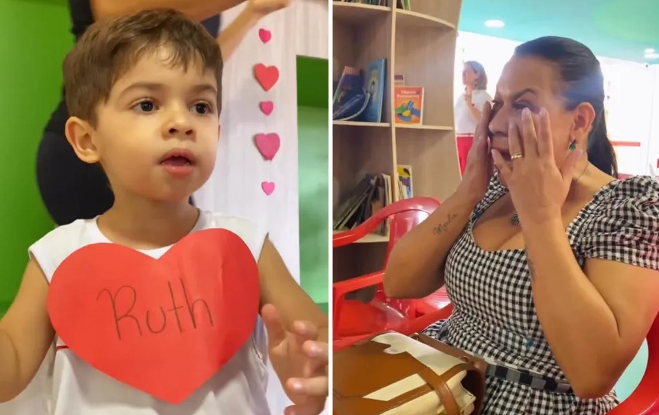 A apresentação começou com uma música cantada por Leo e pelos outros alunos. Em seguida, o menino correu para os braços da avó, ainda emocionada. O vídeo mostra Leo pintando o nome de Dona Ruth e, em seguida, eles brincando.