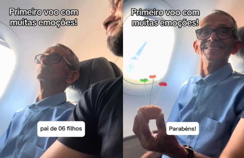 A primeira viagem de avião do Durval Borges Silveira, de 79 anos, foi repleta de emoções. Isso porque ele foi homenageado pela companhia aérea e recebeu o carinho da tripulação e dos passageiros. Rodrigo Santana, filho do idoso, registrou o momento e publicou nas redes sociais, emocionando os internautas.