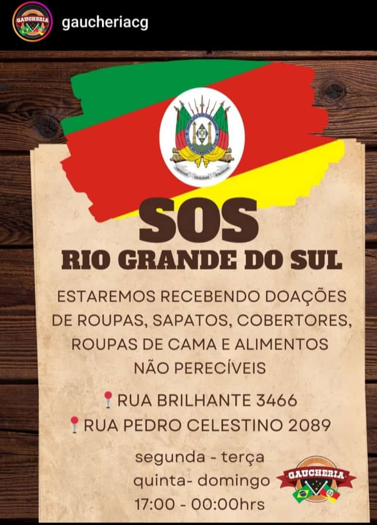 O restaurante de pratos típicos de Rio Grande do Sul, Gaucheria CG está realizando a campanha "SOS RS". Após a tragédia provocada pelas fortes chuvas nas cidades gaúchas, a ação tem como objetivo arrecadar doações para serem enviadas as famílias que estão passando por um momento difícil devido as enchentes.