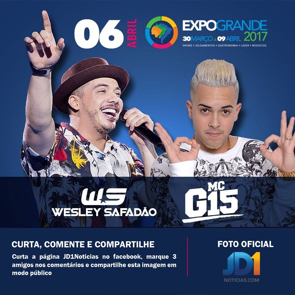 Começa nesta segunda-feira (3), mais uma promoção do JD1 Notícias. Desta vez serão sorteados cinco pares de ingressos para os shows do Wesley Safadão e MC G15 na Expogrande 2017, a maior feira agropecuária do Centro-Oeste e que promete animar a capital com suas atrações musicais.